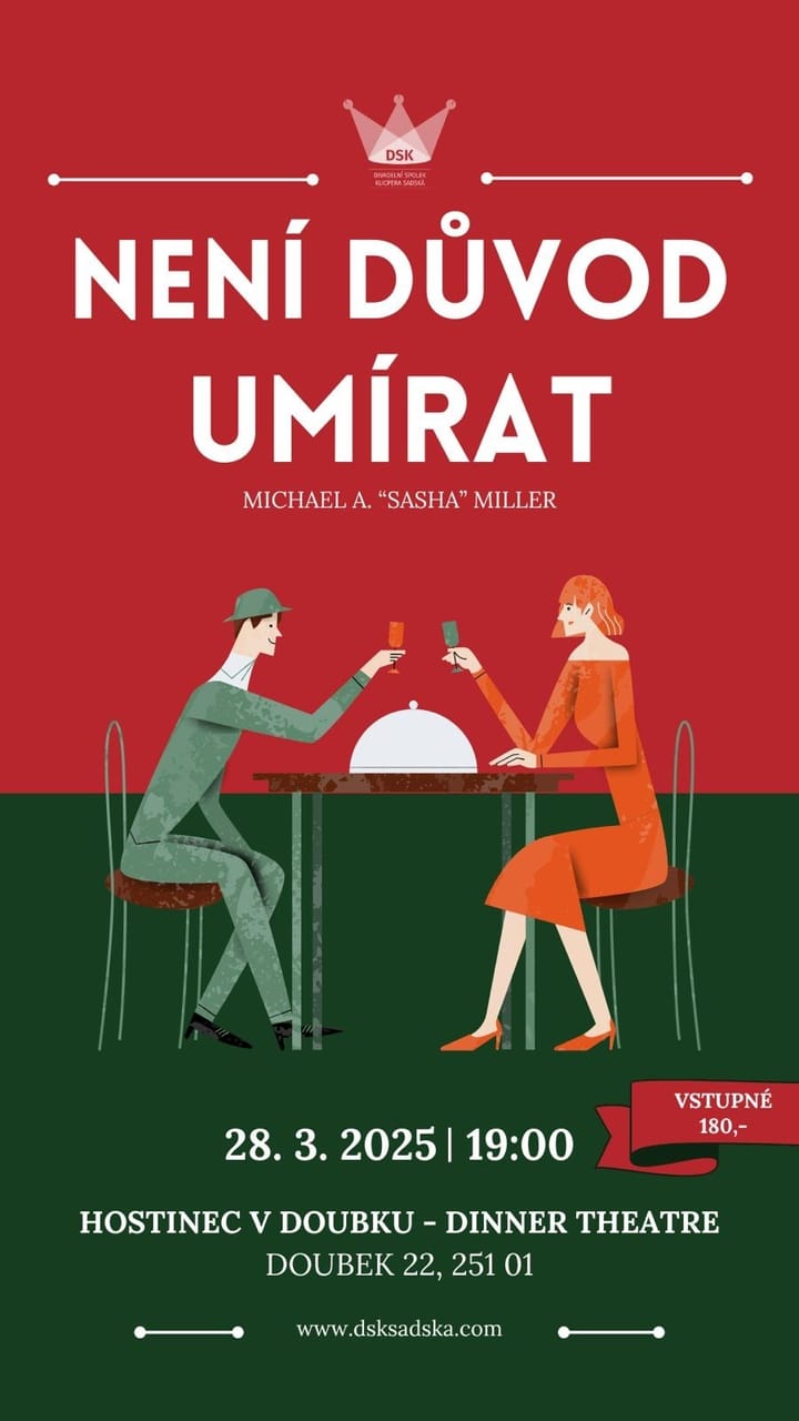 Není důvod umírat je komediální thriller z pera oceňovaného amerického spisovatel Michaela A. Millera, kterou jsme si našli, následně přeložili a tím i jako první v České republice uvedli. Inscenace získala řadu cen na přehlídce Klicperovy divadelní dny 2024 a postoupila na divadelní přehlídku Krakonošův divadelní podzim ve Vysokém nad Jizerou 2024.