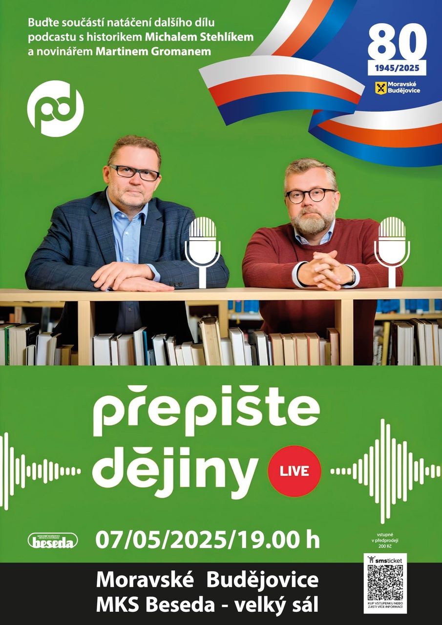 Oblíbené duo historiků se svým putovním podcastem Přepište dějiny zavítá do Moravských Budějovic. Martin Groman a Michal Stehlík podiskutují spolu i s místním publikem o nečekaných zákrutech české historie. Tentokrát o konci 2. světové války v našem městě a regionu, a změnách jeho interpretace v čase. Něco uvedou na pravou míru, něčím své posluchače zase z míry vyvedou, ale před žádným tématem necouvnou.