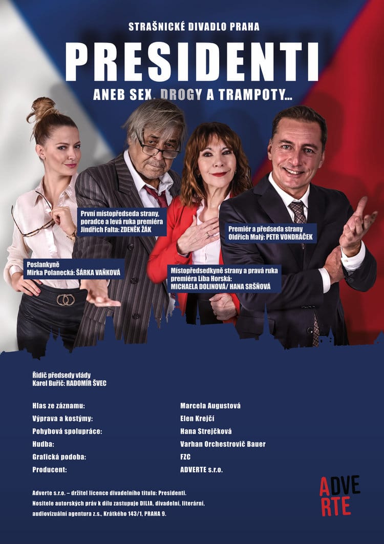 Nová komedie z pera Martina Simandla exkluzivně ve Strašnickém divadle! Hra nabízí neúprosný pohled do zákulisí politiky, do způsobu myšlení jejich vykonavatelů, protagonistů i vykořisťovatelů… a volby se blíží! A dokonce volba nejvyššího. Koho delegovat? Někoho průchozího, někoho nejmíň závadného a zmazaného, někoho, koho nám lid zbaští i s navijákem, s kým se prostý lid identifikuje, a kdo nás ostatní na šachovém poli neobětuje…