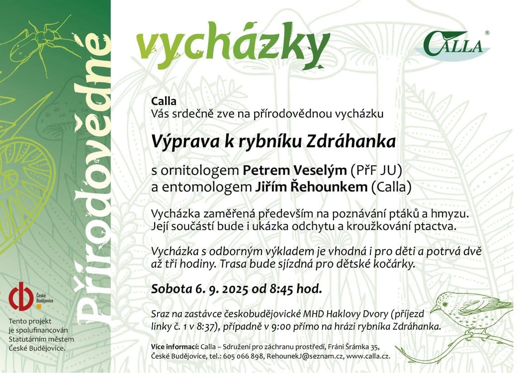 Calla Vás srdečně zvou na přírodovědnou vycházku „Výprava k rybníku Zdráhanka“ s ornitologem Petrem Veselým (PřF JU) a entomologem Jiřím Řehounkem (Calla). Vycházka zaměřená především na poznávání ptáků a hmyzu. Její součástí bude i ukázka odchytu a kroužkování ptactva. Vycházka s odborným výkladem je vhodná i pro děti a potrvá dvě až tři hodiny. Trasa bude sjízdná pro dětské kočárky.
