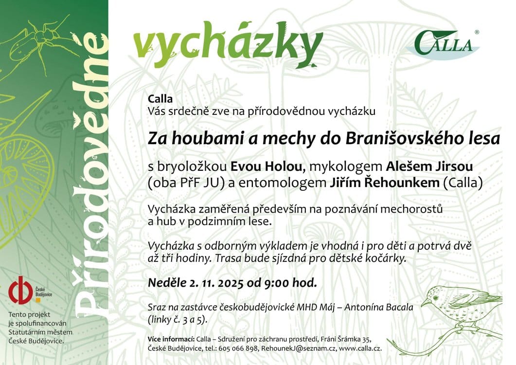 Calla Vás srdečně zvou na přírodovědnou vycházku „Za houbami a mechy do Branišovského lesa“ s bryoložkou Evou Holou, mykologem Alešem Jirsou (oba PřF JU) a entomologem Jiřím Řehounkem (Calla).
