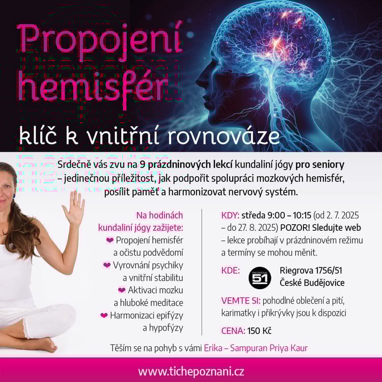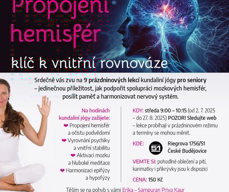 Srdečně vás zvu na 9 prázdninových lekcí kundaliní jógy pro seniory – jedinečnou příležitost, jak podpořit spolupráci mozkových hemisfér, posílit paměť a harmonizovat nervový systém.