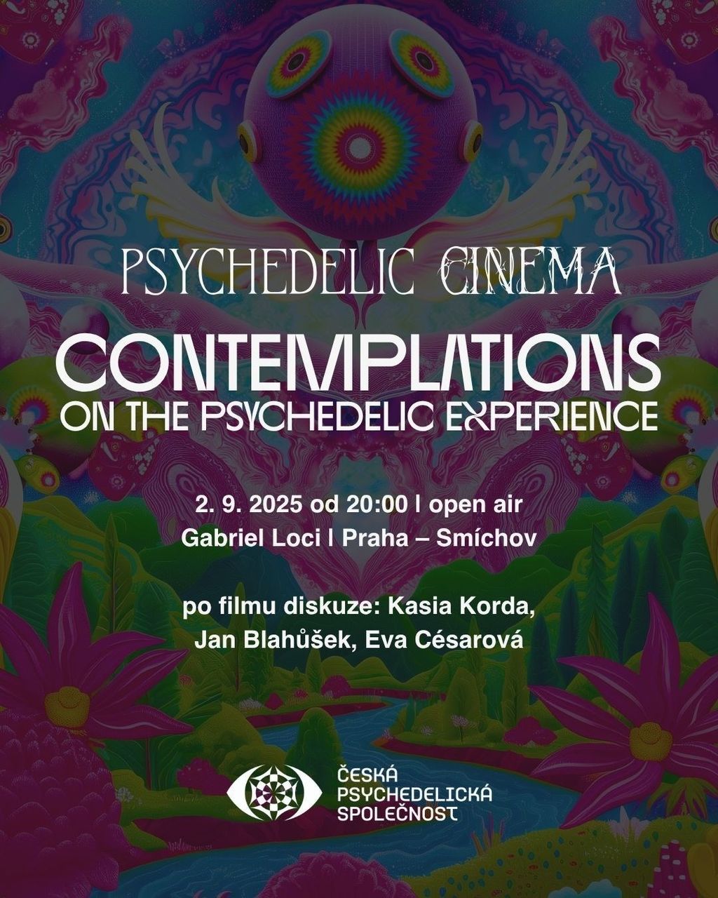 Projekce australského snímku „Contemplations: On the Psychedelic Experience,“ v letním kině Gabriel Loci na pražském Smíchově. Po filmu bude následovat diskuze s psycholožkou Katarzynou Kordou Jedzokovou a religionistou Janem Blahůškem, moderovat diskuzi bude spoluzakladatelka CZEPS, adiktoložka Eva Césarová.