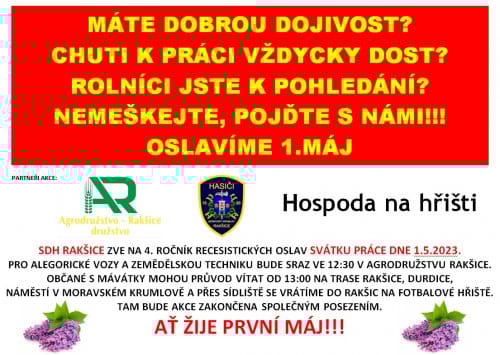 Recesistické oslavy 1. máje nabídne Moravský Krumlov. Nebude chybět spanilá jízda poněkud starších vozidel, traktorů i motocyklů, tradiční výzdoba prvomájových oslav a v ulicích lidé s mávátky… Originální retro akci, která chce hlavně pobavit, má na svědomí Sbor dobrovolných hasičů Rakšice.