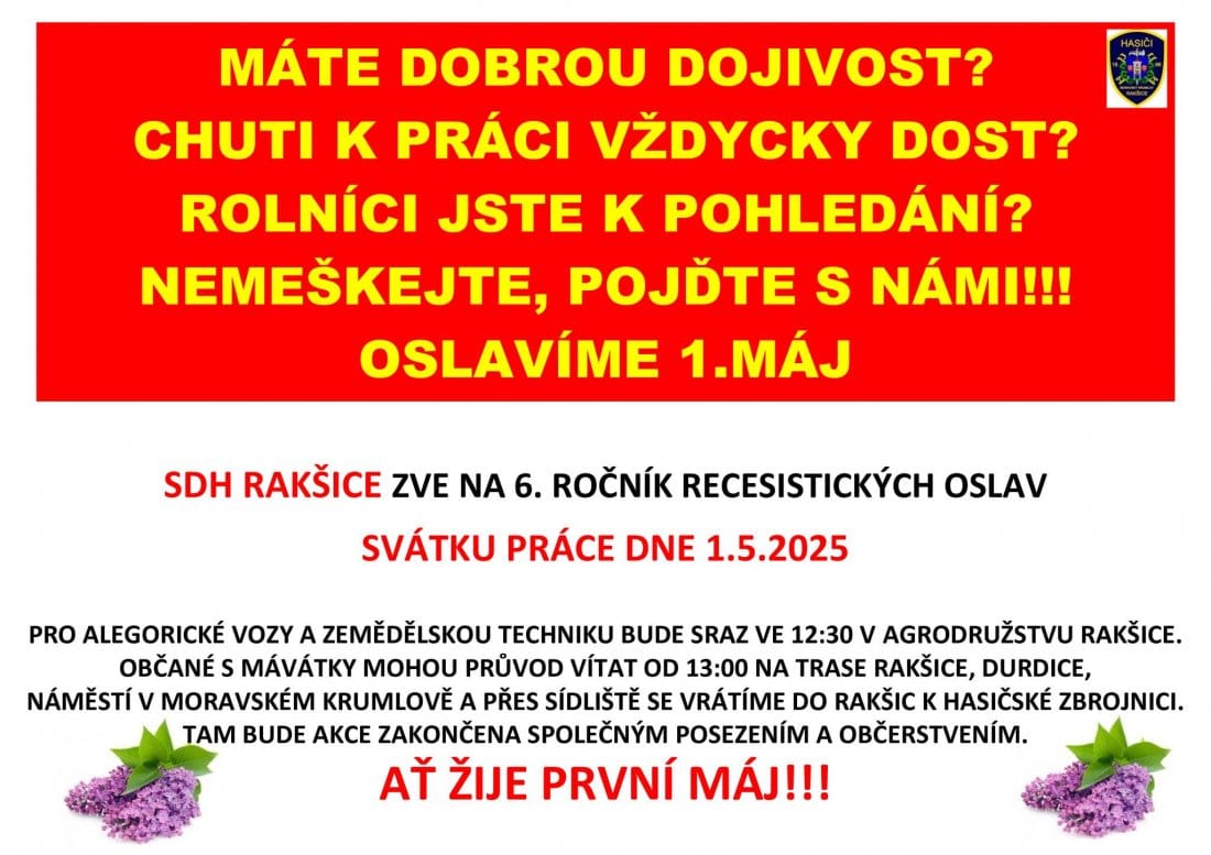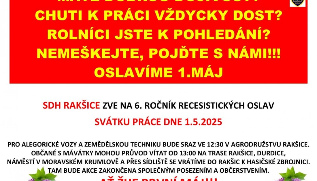 Recesistické oslavy 1. máje nabídne Moravský Krumlov v Rakšicích. Sbor dobrovolných hasičů opět připravil zábavný a atypický program, který začíná od 13. hodin. I letos se můžete těšit na zajímavá vozidla, traktory, motocykly a mnoho dalšího s výzdobou prvomájových oslav i s mávátky v ulicích.  Průvod bude slavnostně zakončen i s občerstvením u hasičské zbrojnice v Rakšicích.
