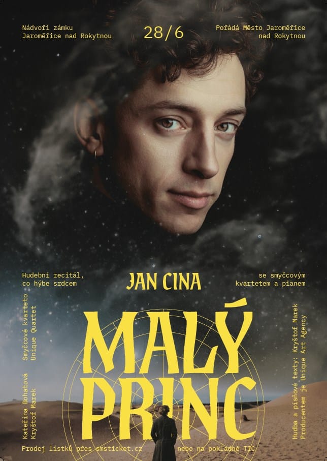 RECITÁL MALÝ PRINC S JANEM CINOU přináší divákům jedinečné pojetí kouzelného příběhu Antoina de Saint-Exupéryho. Jan Cina vás zavede do moudrého a laskavého světa, kde vše, co je důležité, je očím neviditelné. Nečekejte původní vyprávění příběhu Malého prince, ale originální spojení hudby a slova, které rozehraje vaši fantazii a pohladí na duši.