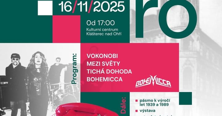 Akce pořádaná k připomenutí 17. listopadu z let 1939 a 1989 16/11/2025 (neděle) Od 17:00 Kulturní centrum Klášterec nad Ohří