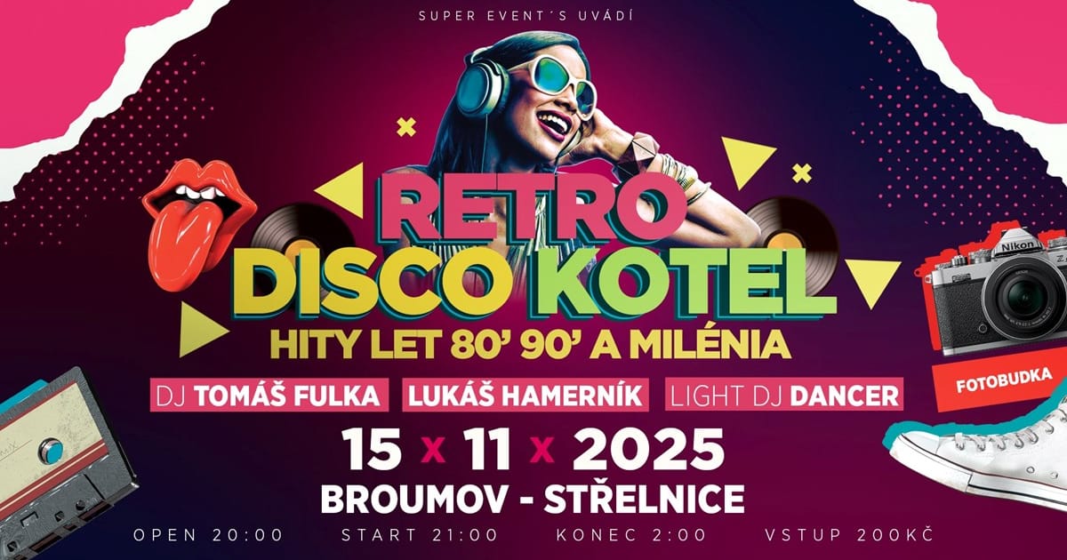 V sobotu 15. listopadu 2025 se na Střeláku v Broumově koná obří retro disko párty s největšími hity od 80″, 90″ let až po milénium!