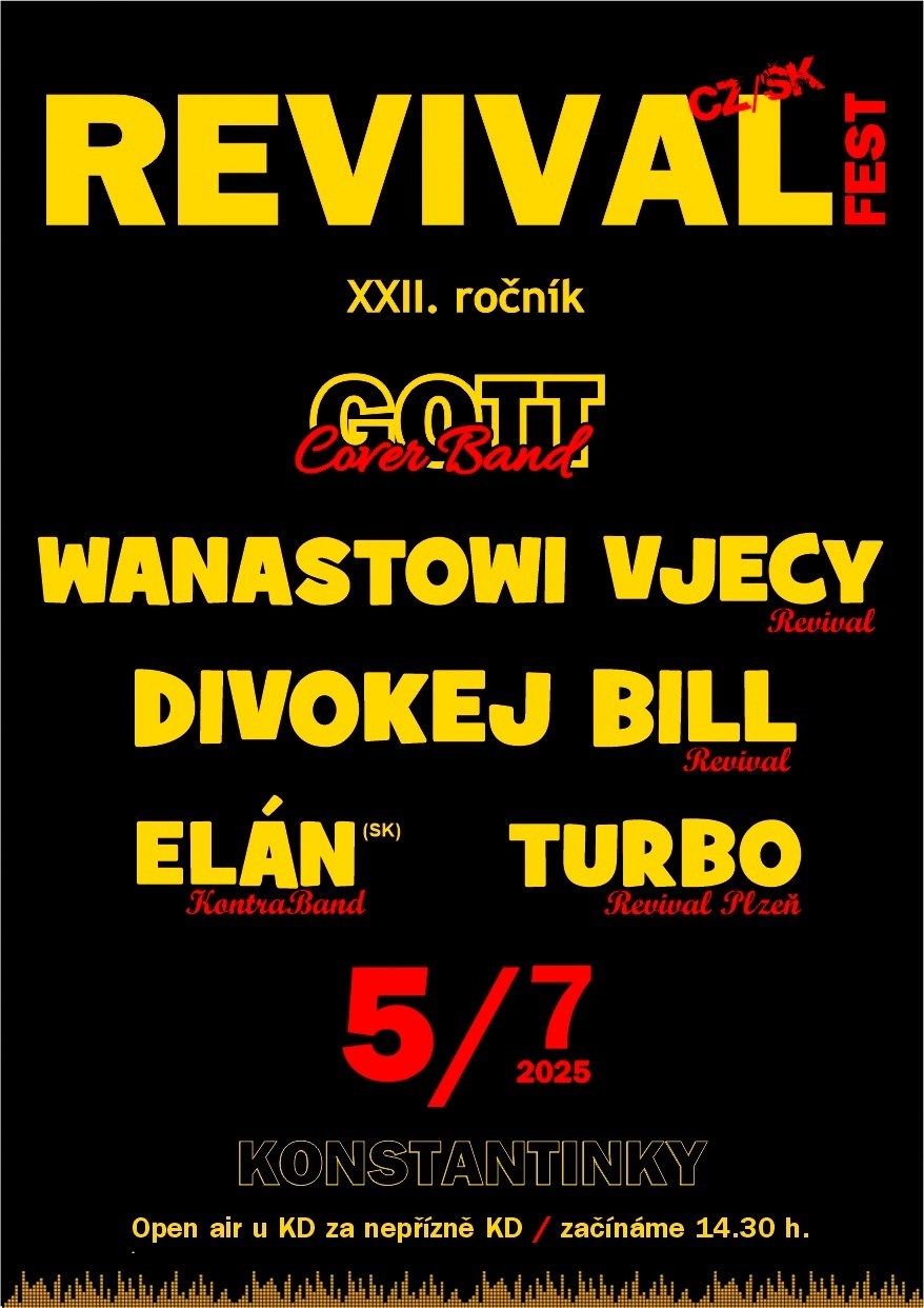 Dámy a pánové, rockeři a tanečníci, připravte se na další legendární mejdan! Druhá nejstarší akce v novodobých Konstantinkách, REVIVAL FEST, slaví v roce 2025 své dvacáté druhé narozeniny. Z malého festíku se stala jedna z největších a nejnavštěvovanějších akcí v širokém okolí, a letos to bude opět jízda, jakou si zasloužíte!