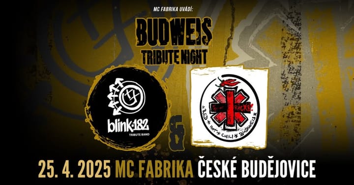 BUDWEIS TRIBUTE NIGHT – Dvě domácí tribute kapely v jeden večer, na jednom podiu * RED HOT CHILLI BUDWEIS /www.facebook.com/profile.php?id=61569011902619 * BLINK 182 TRIBUTE BAND www.facebook.com/profile.php?id=61569011902619