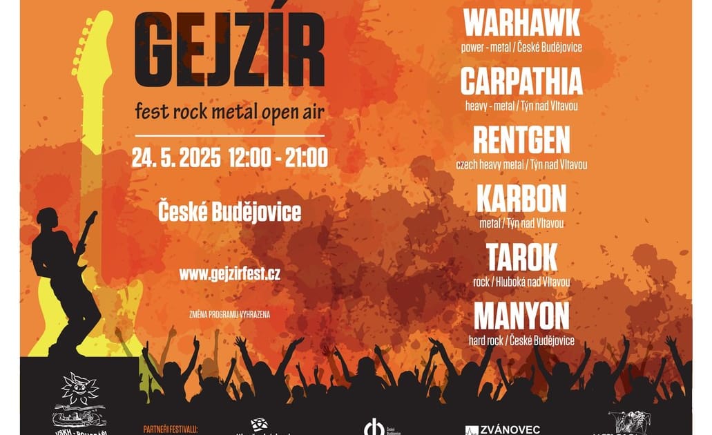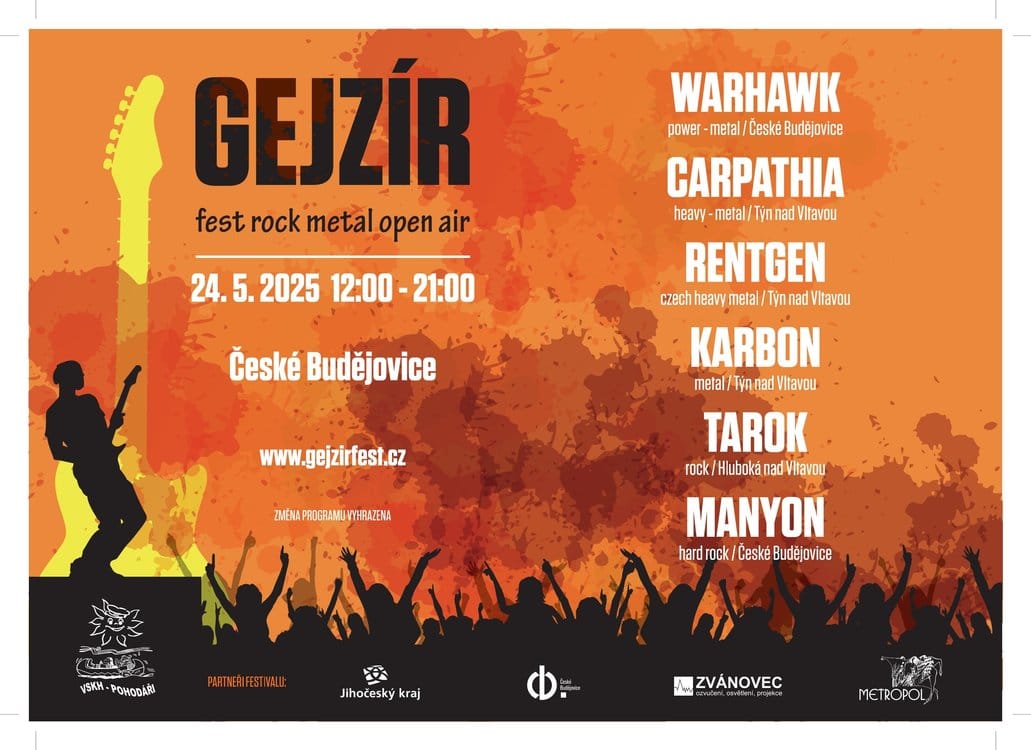 Přijď hodit „paroháče“ v sobotu od 12:00 hodin na rock metalový GEJZÍRFEST. Uvidíte, uslyšíte skupiny WARHAWK power -metal České Budějovice, Carpathia heavy-metal Týn nad Vltavou, Karbon metal Týn nad Vltavou, RENTGEN heavy-metal Týn nad Vltavou, MANYON hard rock České Budějovice.