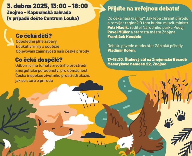 Znáte lišku, která bydlí za rohem? Nebo orla, co létá nad Dyjí? Přijďte si užít parádní rodinné odpoledne plné přírody, her a objevování! Od 13 do 18 hod. vás v Kapucínské zahradě ve Znojmě za Vlkovou věží čeká rodinný program se soutěžemi a spoustou zajímavostí o přírodě. V případě nepříznivého počasí se akce přesune do znojemského Centra Louka.
