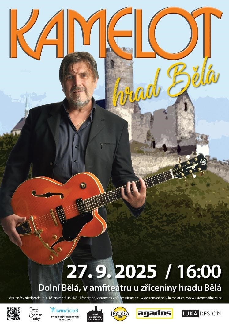 Srdečně vás zveme na koncert legendární skupiny Kamelot v čele s Romanem Horkým v amfiteátru u zříceniny hradu Bělá v sobotu 27. 9. 2025 v 16:00 hodin.