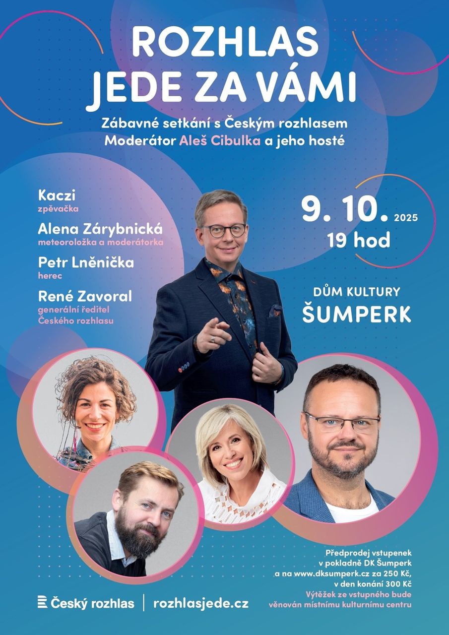 Oblíbená zábavná show „Rozhlas jede za vámi“ s moderátorem Alešem Cibulkou se vydává na cestu po celé České republice. A v říjnu zavítá do šumperského domu kultury. V průběhu pořadu mohou diváci soutěžit o upomínkové předměty a hodnotné ceny. Soutěž s (ne)záludnými otázkami připravuje moderátor Michal Jagelka.