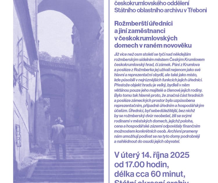 Značná část prostor českokrumlovského hradu byla za dob Rožmberků uzpůsobena reprezentačním, případně úředním a hospodářským účelům. Úředníci, byť sebedůležitější, bez nichž by se rožmberský dvůr neobešel, žili se svými rodinami v městských domech. Archivní prameny umožňují podívat se na tyto domy podrobněji a nahlédnout do osudů jejich obyvatel.