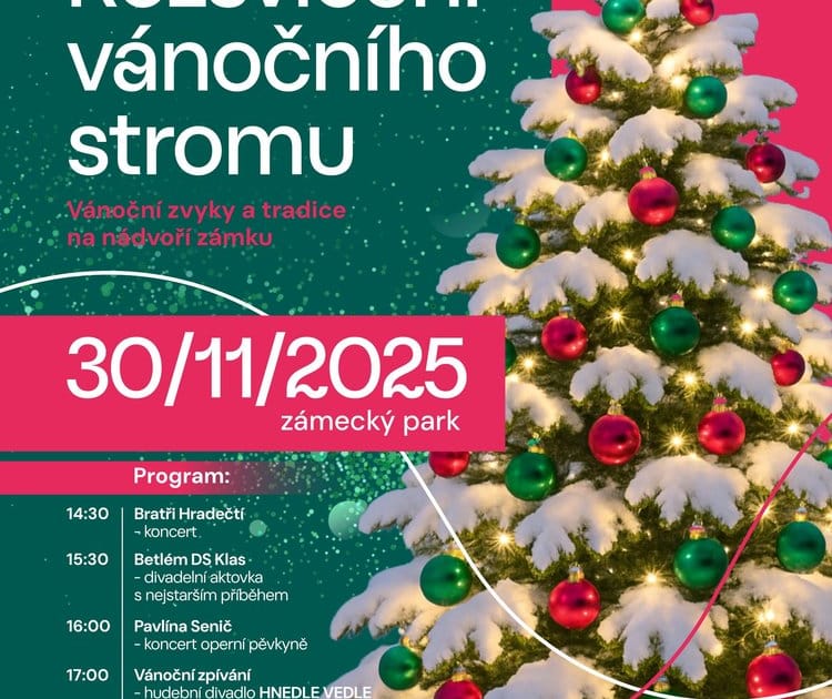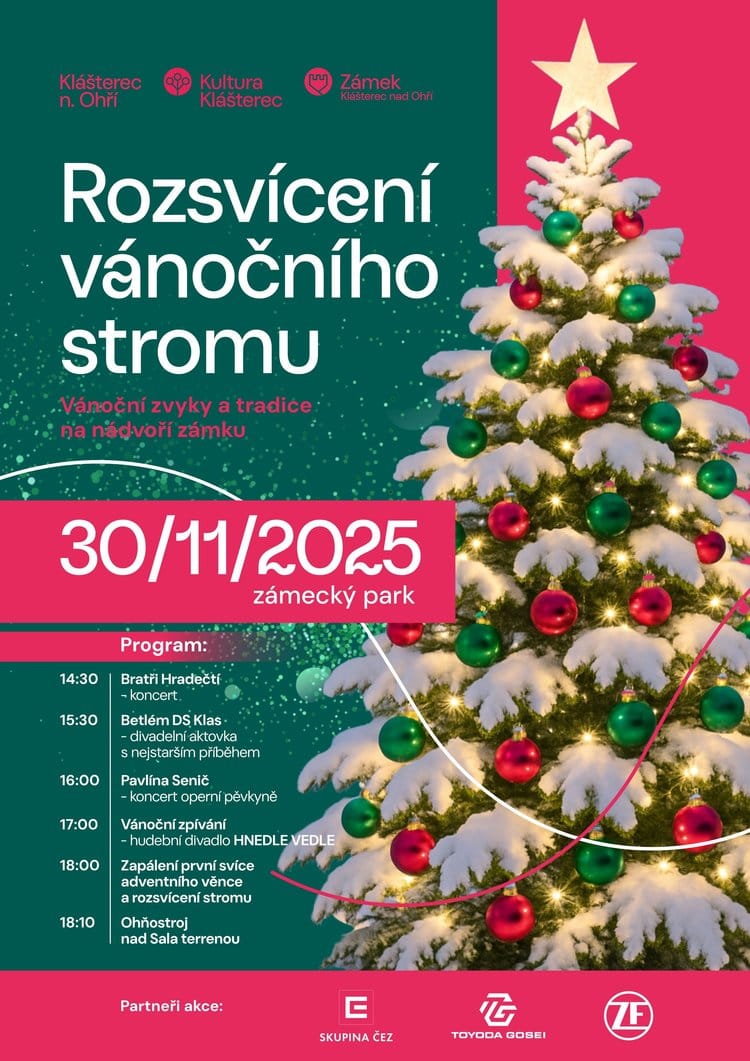 Přijďte společně s námi zahájit adventní čas tradičním rozsvícením vánočního stromu v zámeckém parku Klášterce nad Ohří.Těšit se můžete na hudební vystoupení, divadelní představení, zpívání koled, koncert operní pěvkyně Pavlíny Senić a závěrečný ohňostroj nad Sala terrenou.Součástí programu bude také zapálení první svíce adventního věnce.Nechte se naladit na vánoční atmosféru plnou světel, tradic a radosti!