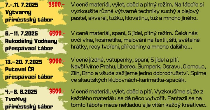 V ceně materiál, spaní, 5 jídel, pitný režim. Čeká nás ovčí vlna, kosmetika, malování na textil, šití, světelné hrátky, recy tvoření, přírodniny a mnoho dalšího…
