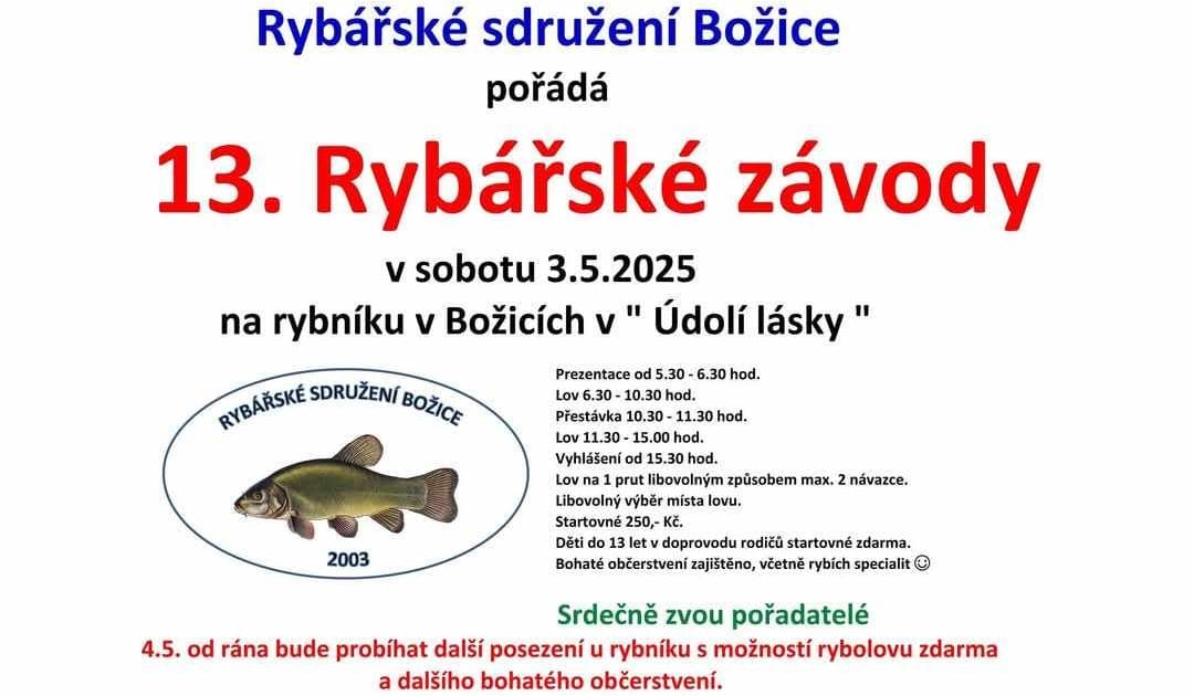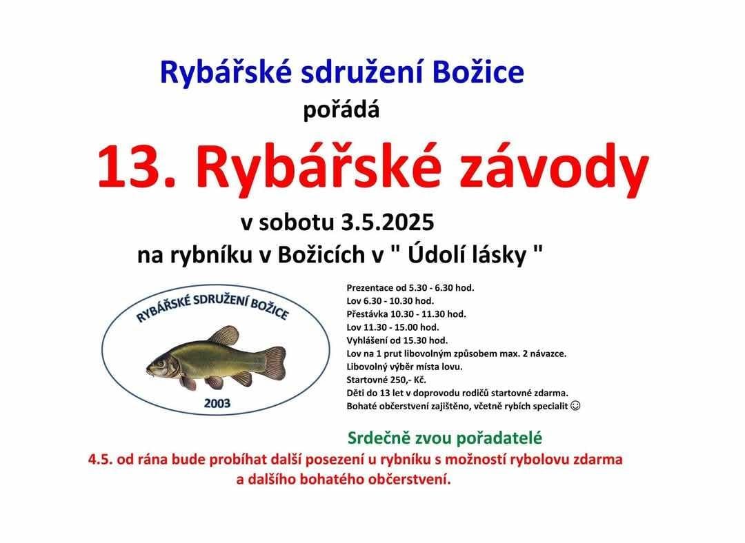 Rybářské sdružení Božice pořádá v sobotu 3. května na Božickém rybníku v Údolí lásky 13. ročník Rybářských závodů s libovolným výběrem místa lovu. Na místě bude zajištěno bohaté občerstvení, včetně rybích specialit. V neděli 4. května pak bude od rána probíhat další posezení u rybníka s možností rybolovu a dalšího občerstvení.