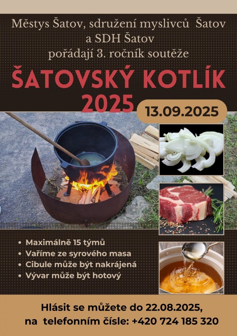 Na 3. ročník soutěže o nejlepší kotlíkový guláš zve městys Šatov. Akce zaměřená na gastronomii proběhne druhou zářijovou sobotu. Soutěžit bude maximálně 15 týmů a přihlásit svůj tým do soutěže je možné až do 22. srpna na tel. čísle: + 420 724 185 320.