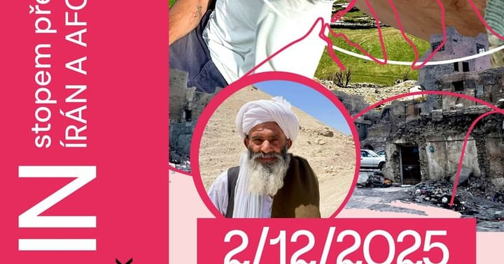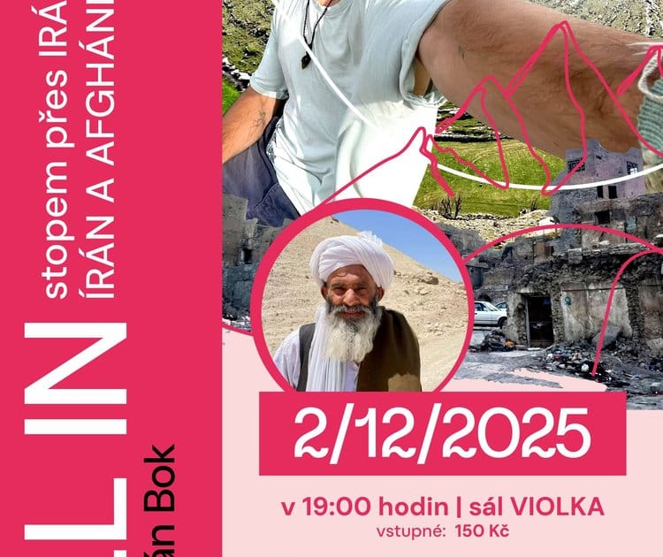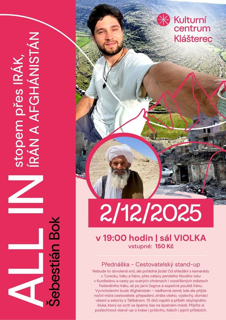 Přednáška – cestovatelský stand-upNebude to dovolená snů, ale pořádná jízda! Od shledání s kamarády v Turecku, Iráku a Íránu, přes oslavy perského Nového roku v Kurdistánu a cesty po svatých chrámech i rozstřílených městech Federálního Iráku, až po jarní Zagros a sopečnou poušť Íránu.Vyvrcholením bude Afghánistán – nádherná země, kde ale přijde i noční můra cestovatele: přepadení, ztráta všeho, vyhození, vězení a eskorty s Tálibánem.15 000 km napětí a příběh obyčejného kluka, který se ocitl ve špatný čas na špatném místě.Přijďte si poslechnout stand-up o kráse i hrůzách, o lidech i jejich příbězích.2/12/2025 od 19:00Kulturní centrum Klášterec nad Ohří – sál ViolkaVstupné: 150 Kč