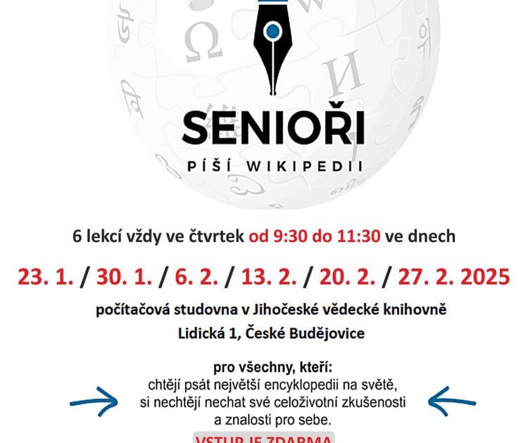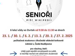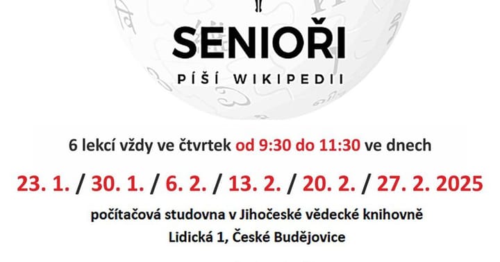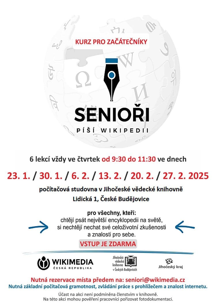 6 seminářů pro začátečníky, kteří se chtějí naučit základy editování na Wikipedii. Nutná základní znalost na PC (23.1., 30.1., 6.2., 13.2., 20.2.,27.2. 9:30-11:30). Nutná rezervace na seniori@wikimedia.cz.