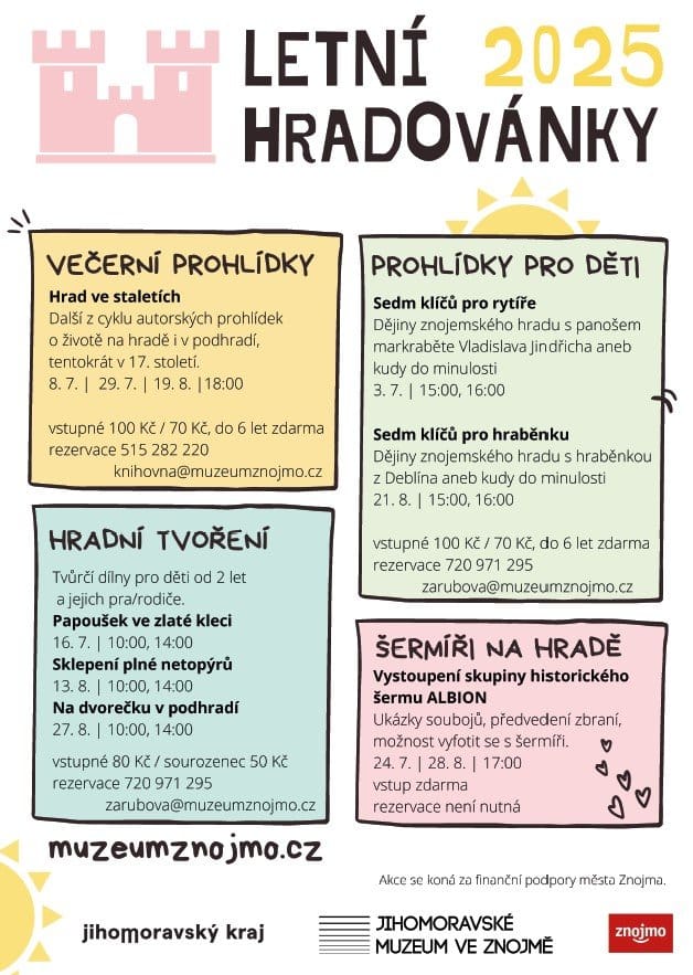 V rámci prázdninového programu Letní hradovánky 2025 na Znojemském hradě zve Jihomoravské muzeum ve Znojmě na vystoupení šermířské skupiny ALBION. Začátek v 17 hod. na hlavním nádvoří. Vstup zdarma. Rezervace předem není nutná.