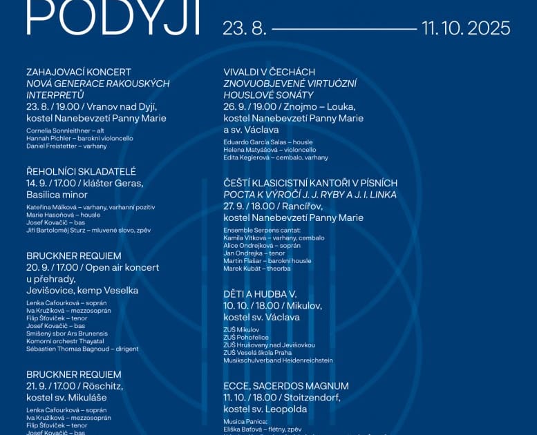 Letošní ročník nabídne posluchačům celkem 8 koncertů českých i rakouských umělců – 5 na jižní Moravě a 3 v okolí rakouského Thayatalu. Ve Znojmě zazní Vivaldiho znovuobjevené virtuózní sonáty v podání houslisty Eduardo García Salas. Začátek koncertu v 19 hod. Vstupné dobrovolné.