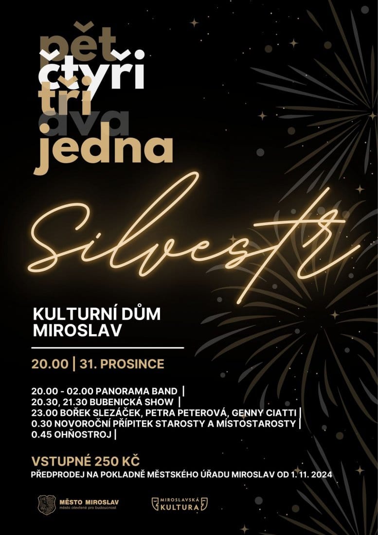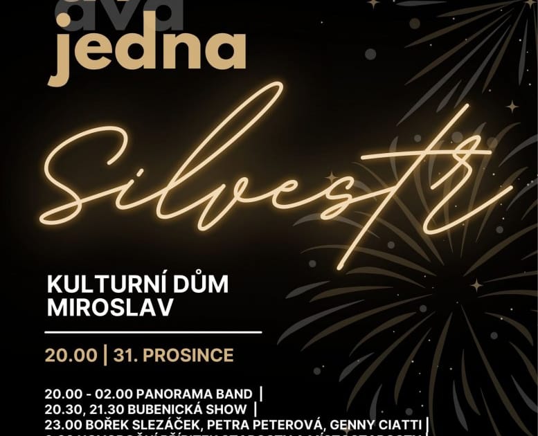Nenechte si ujít Silvestrovskou oslavu v Kulturním domě v Miroslavi, kde na Vás čeká program od 20 hod. až do 1. hodiny Nového roku. Po celý večer bude hrát kapela Panorama Band a v průběhu akce vystoupí bubeníci se svojí show i známí zpěváci Bořek Slezáček, Petra Peterová a Genny Ciatti. Celý večer slavnostně zakončí ohňostroj.