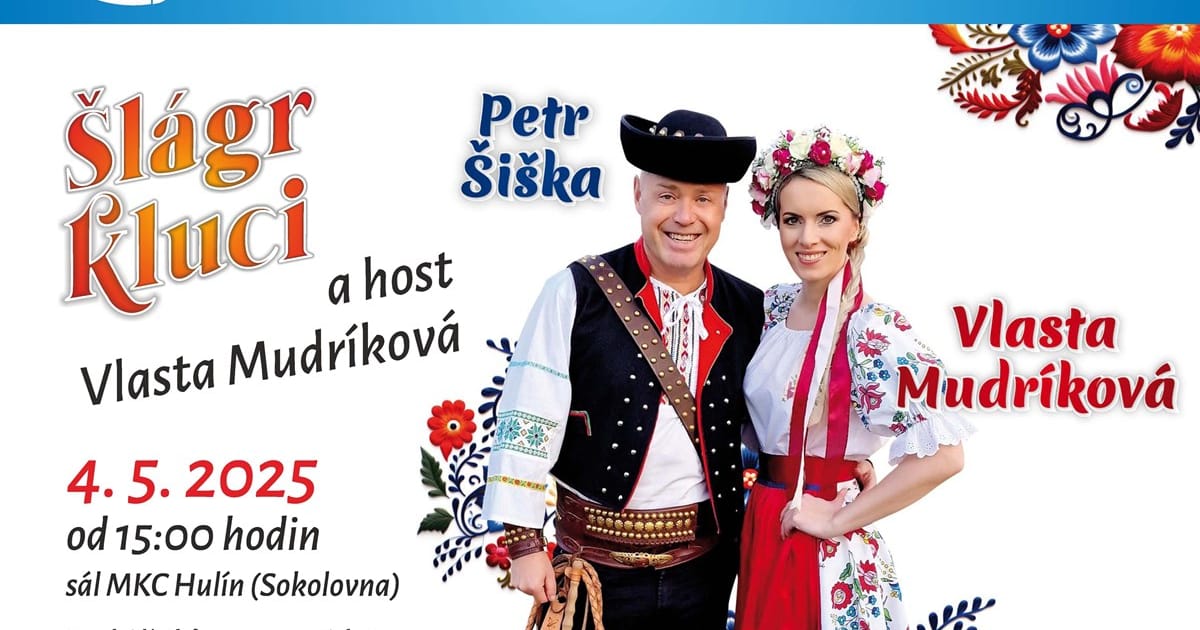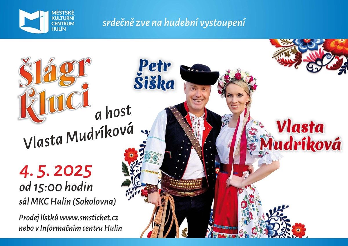 MKC Hulín srdečně zve na hudební vystoupení ŠLÁGR KLUCI, které se uskuteční 4. 5. 2025 od 15:00 v sále MKC Hulín (nová sokolovna).