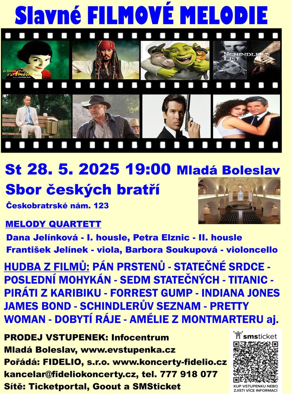 V sále Sboru českých bratřích pro Vás přípravujeme koncert, kde na vás čekají vynikající aranže slavných filmových melodií tentokráte od Melody Quartetta.