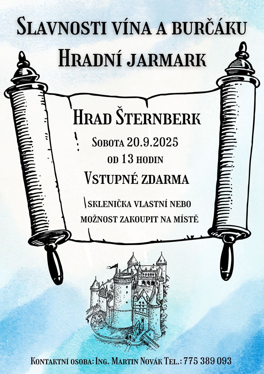 Slavnosti vína a burčáku spojené s jarmarkem a to vše třetí zářijovou sobotu na hradě Šternberk. Budeme se těšit na všechny, kteří si budou chtít užít sobotní odpoledne u skleničky vína, kelímku pravého moravského burčáku přímo z rukou předních vinařství nebo si zakoupit něco na hradním jarmarku.