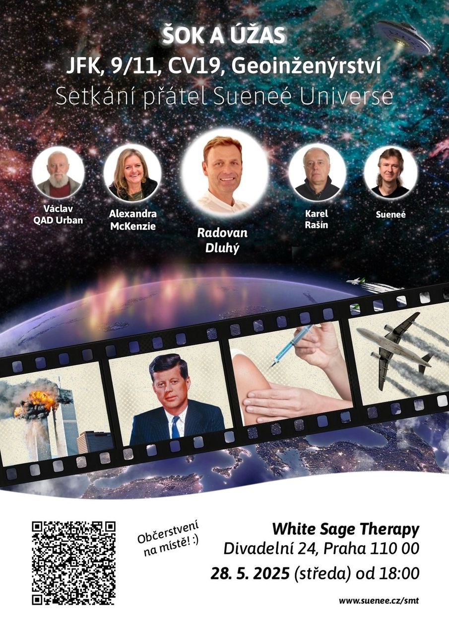 Zveme vás na setkání přátel a fanoušků zpravodajského serveru Sueneé Universe! Pojďme společně tvořit nový vesmír, setkat se u dobrého jídla v přátelské neformální atmosféře, sdílet zážitky ze setkání s ET. Téma: ŠOK A ÚŽAS: JFK, 9/11, CV19, Geoinženýrství