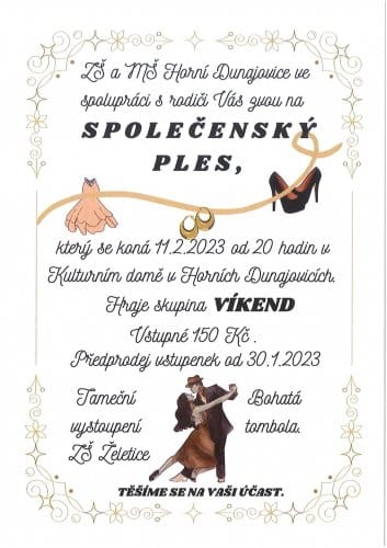 Kulturní dům v Horních Dunajovicích bude od 20 hod. patřit hudbě a tanci. Hraje skupina Víkend a připraveno je taneční vystoupení ZŠ Želetice i bohatá tombola.