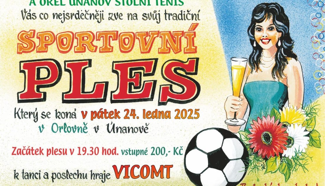 V sále únanovské Orlovny se každoročně v lednu pořádá Sportovní ples. K tanci a poslechu zahraje od 19:30 hod. skupina Vicomt a těšit se můžete i na bohatou tombolu.