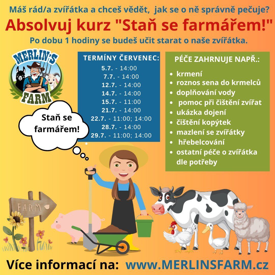 Máš rád/a zvířátka a chtěl/a bys vědět, jak se o ně správně pečuje? Absolvuj kurz „Staň se farmářem!“ na Merlinově farmě v Excalibur City. Po dobu 1 hodiny se budeš učit správně starat o zvířátka. Péče zahrnuje drobné pomocné a ošetřovatelské práce jako například: krmení, roznos sena do krmelců, doplňování vody, pomoc při čištění zvířat, ukázku dojení, čištění kopýtek, mazlení se zvířátky, hřebelcování a ostatní péči o zvířátka dle potřeby.