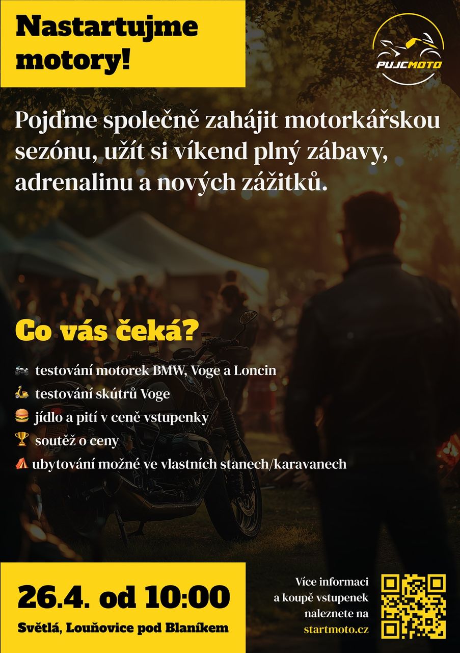 Milí motorkáři a milovnice jedné stopy, je to tady! Slunce začíná hřát, silnice se probouzí ze zimního spánku a my se opět můžeme vydat vstříc novým dobrodružstvím. Zveme vás na oficiální zahájení motorkářské sezóny s pujcmoto.cz, kde nebude chybět skvělá atmosféra, dobré jídlo, hudba a možnost vyzkoušet naše motorky z půjčovny a našeho hlavního partnera Voge.