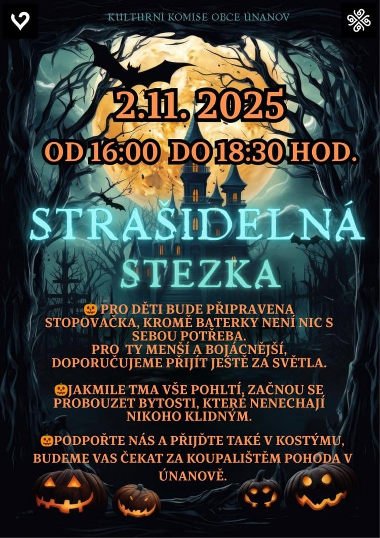 Na trochu strašidelnou Halloweenskou stezku se můžete po setmění s dětmi vypravit také do Únanova. Startuje se v 16 hod. za areálem koupaliště a autokempu Pohoda.