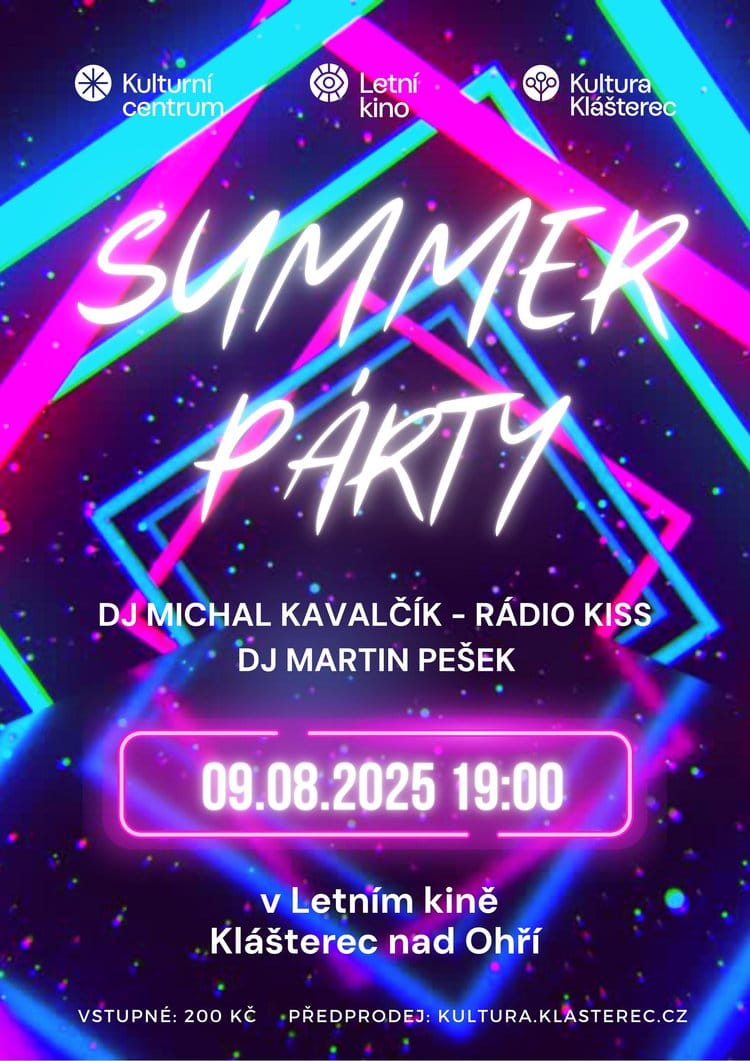 SUMMER PÁRTY SOBOTA 9. srpna 2025 | 19:00 Letní kino Klášterec nad OhříLetní párty pod širým nebem s hudbou, světly a atmosférou plnou energie.
