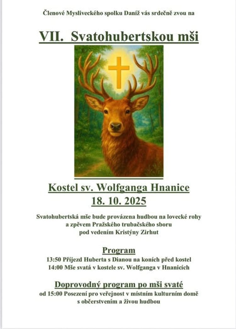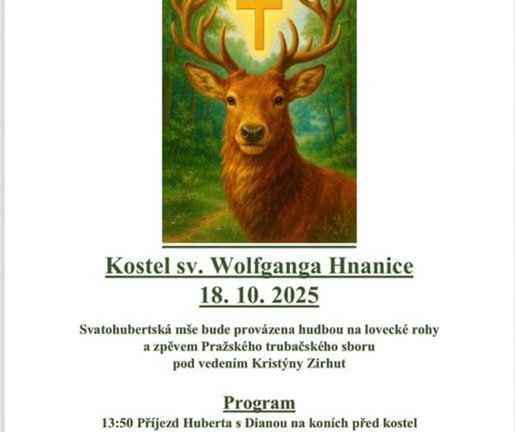 Jako hold české myslivosti a přírodě proběhne v kostele sv. Wolfganga v Hnanicích slavnostní mše k poctě svatého Huberta, patrona všech střelců, myslivců a lesníků. Bude sloužena za hudebního doprovodu mysliveckých trubačů a následovat po ni bude doprovodný program v místním kulturním domě.