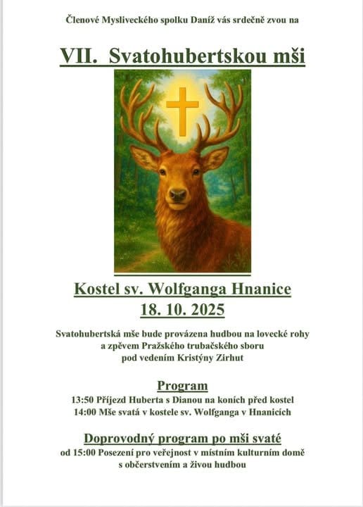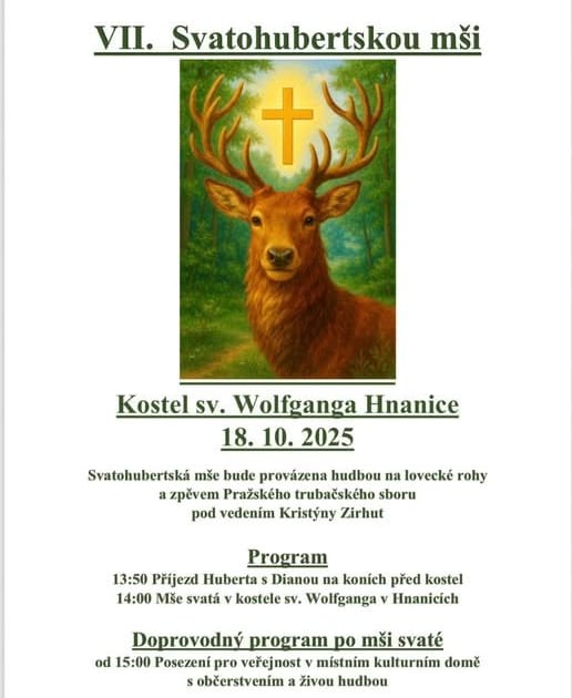 Jako hold české myslivosti a přírodě proběhne v kostele sv. Wolfganga v Hnanicích slavnostní mše k poctě svatého Huberta, patrona všech střelců, myslivců a lesníků. Bude sloužena za hudebního doprovodu mysliveckých trubačů a následovat po ni bude doprovodný program v místním kulturním domě.