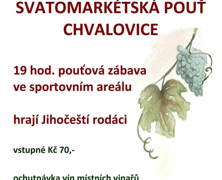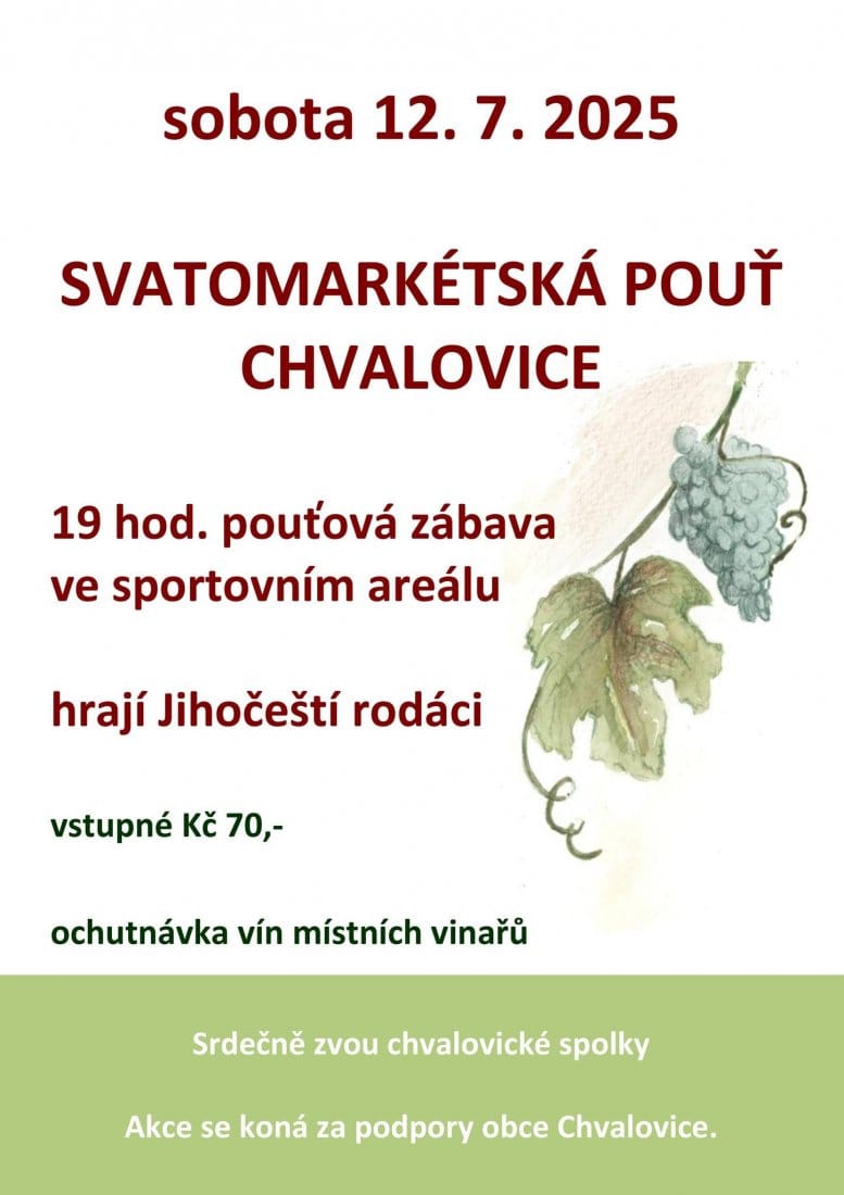 V polovině července se ve Chvalovicích odehraje tradiční pouť konaná u příležitosti svátku sv. Markéty. Těšte se na pestrý (a nejen hudební) program. K poslechu i tanci zahrají Jihočeští rodáci. Během akce bude možná také ochutnávka vín od místních vinařů.