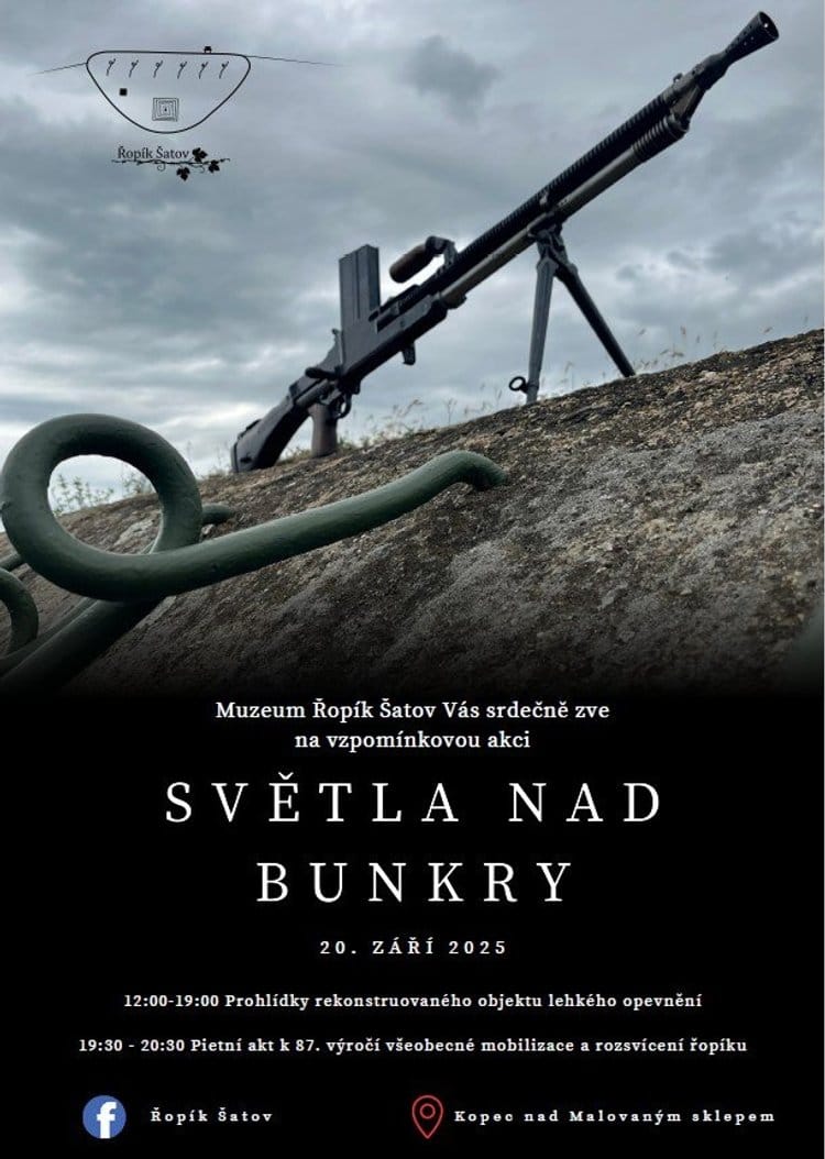 Celorepubliková akce Světla nad bunkry, která každoročně připomíná noc, kdy byla vyhlášena mobilizace, se účastní i Muzeum Řopík Šatov. Na prohlídky rekonstruovaného objektu lehkého opevnění, které budou veřejnosti v tento den otevřeny od 12 do 19 hod., pak naváže pietní akt k 87. výročí od mobilizace a rozsvícení řopíku.