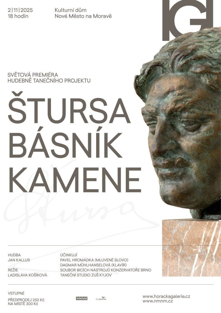 Poslední z letošních mimořádných akcí ke 100. výročí úmrtí Jana Štursy bude hudebně taneční projekt, inspirovaný dílem Jana Štursy na původní hudbu Jana Kalluse v režii Ladislavy Košíkové. V Kulturním domě se představí šestičlenný soubor bicích nástrojů Konzervatoře Brno, klavíristka Dagmar Mühlhanselová, taneční studio ZUŠ Kyjov a herec Slováckého divadla Pavel Hromádka. Délka představení je 45 minut. Nenechte si ujít tuto výjimečnou událost, připravovanou speciálně pro Nové Město na Moravě ke Štursovu výročí!