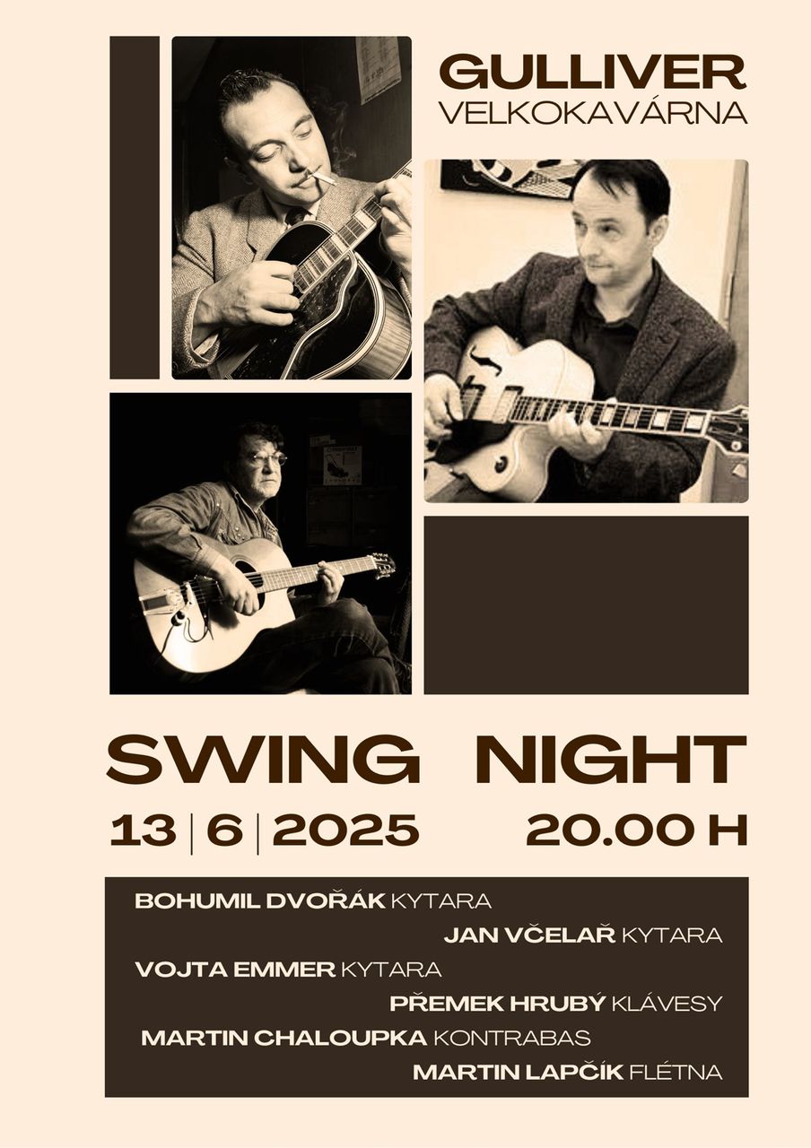 Dovolujeme si Vás pozvat na skoro letní edici SWING NIGHT. Oblíbený tradiční večer v Gulliverově jazzové aréně, na kterém se sejdou výrazné osobnosti zlínské a kutnohorské hudební scény.
