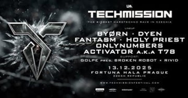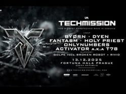 Line-upu prosincové Techmission dominují aktuálně nejúspěšnější jména scény – FANTASM, HOLY PRIEST, ONLYNUMBERS, BYORN, DYEN a T78 pres. Activator. Českou scénu budou na stage reprezentovat Golpe pres. Broken Robot a česko-japonské duo RiViD. Všichni společně vytvoří rave, který publikum provede temnotou až do ranních hodin.