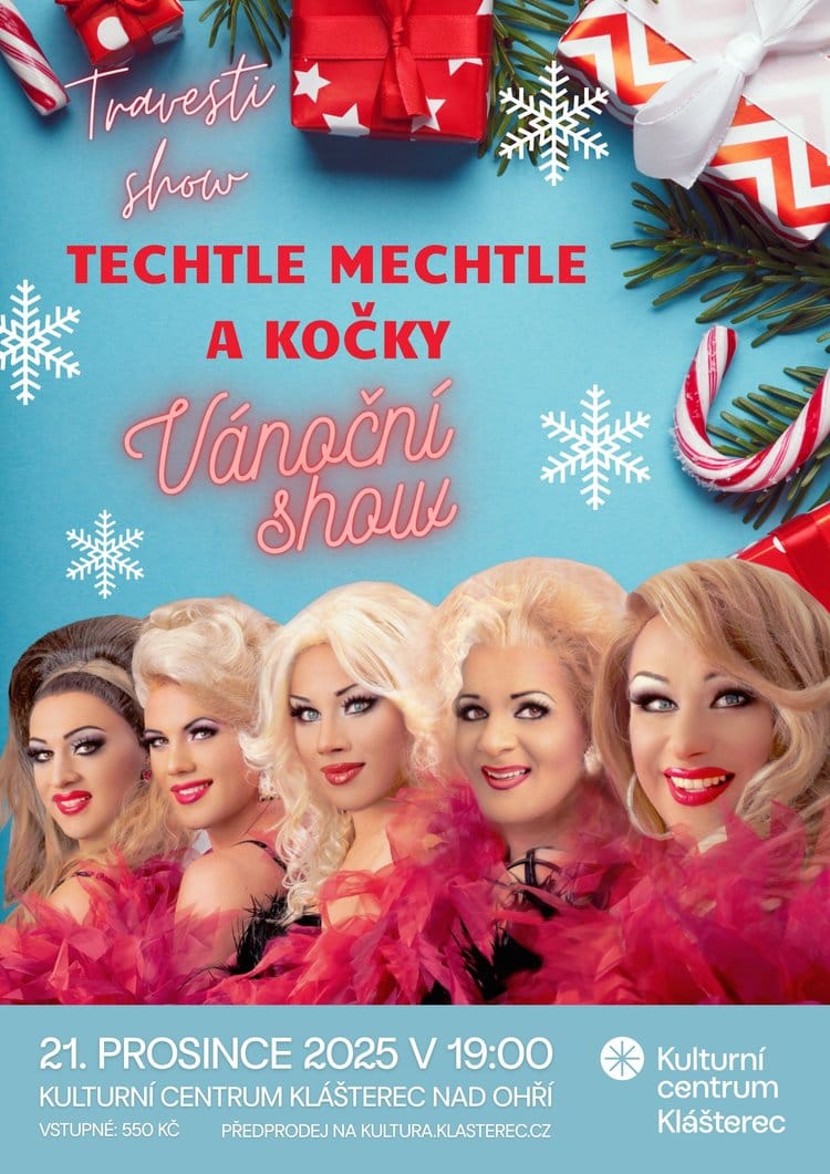 Vánoční atmosféra i známé melodie, nejúspěšnější výběr vystoupení a písniček z předchozích pořadů této známé české travesti skupiny. Travesti revue Techtle Mechtle a Kočky jsou aktuálně nejúspěšnější českou travesti skupinou. Pánové Lukáš, Martin, Jirka, Nikolas a Saša se promění během večera ve známé zpěvačky a herečky. Show, která se těší zájmu v kulturních domech a divadlech po celé České republice. Přijďte se vánočně naladit a odpočinout si od předvánočního shonu.