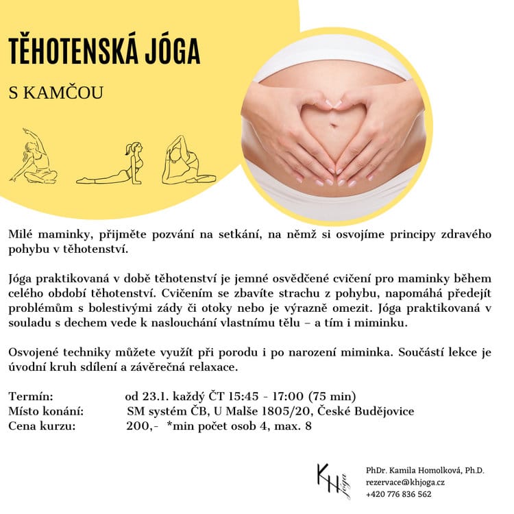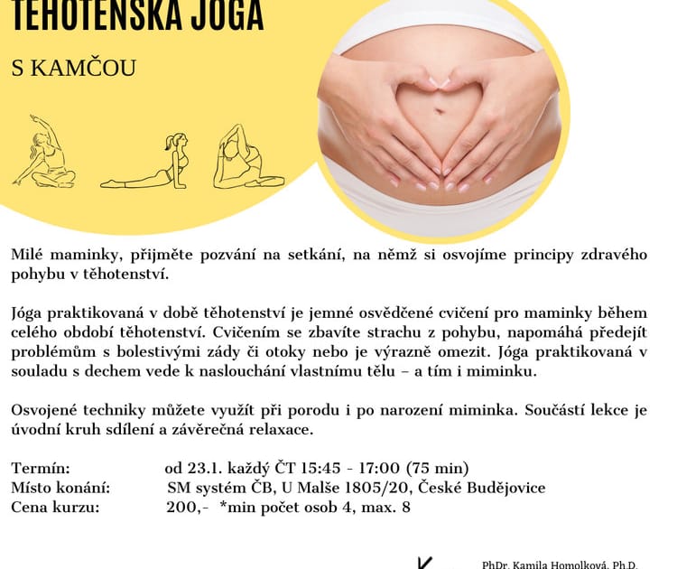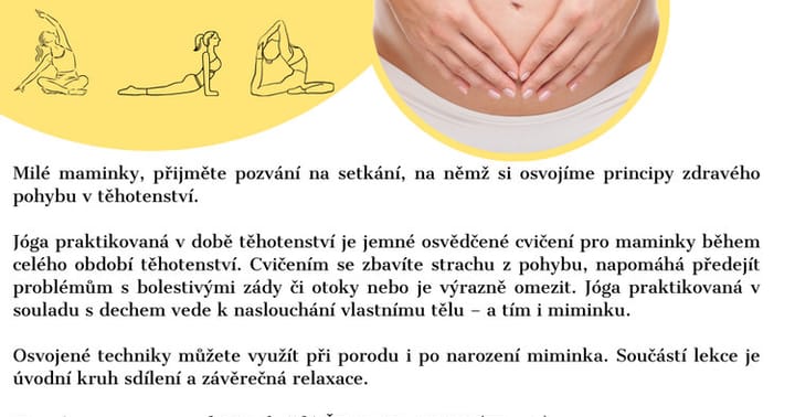 Milé maminky, přijměte pozvání na setkání, na němž si osvojíme principy zdravého pohybu v těhotenství. Jóga praktikovaná v době těhotenství je jemné osvědčené cvičení pro maminky během celého období těhotenství. Cvičením se zbavíte strachu z pohybu, napomáhá předejít problémům s bolestivými zády či otoky nebo je výrazně omezit. Jóga praktikovaná v souladu s dechem vede k naslouchání vlastnímu tělu – a tím i miminku. Osvojené techniky můžete využít při porodu i po narození miminka. Součástí lekce je úvodní kruh sdílení a závěrečná relaxace.