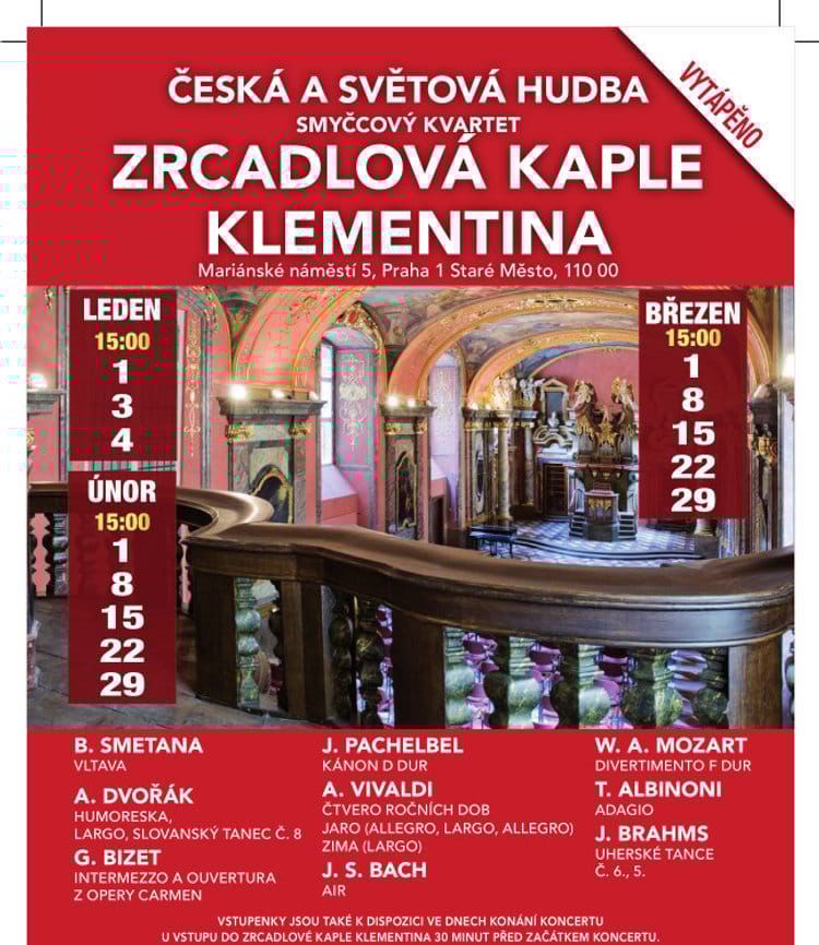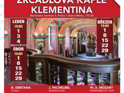 Koncert se koná v Zrcadlové kapli Klementina, která v zimním období vytápěna. Krásný koncert umocní prostředí Zrcadlové kaple, která je jedním z největších pokladů Klementina s dechberoucí akustikou. Nachází se v samém srdci Prahy a patří k nejkrásnějším památkám. V rámci našeho koncertu si můžete tento krásný barokní sál Zrcadlové kaple prohlédnout a užít si jedinečnost a nádheru tohoto skvostu Klementina, v jejíchž sálech koncertoval dokonce i W. A. Mozart.