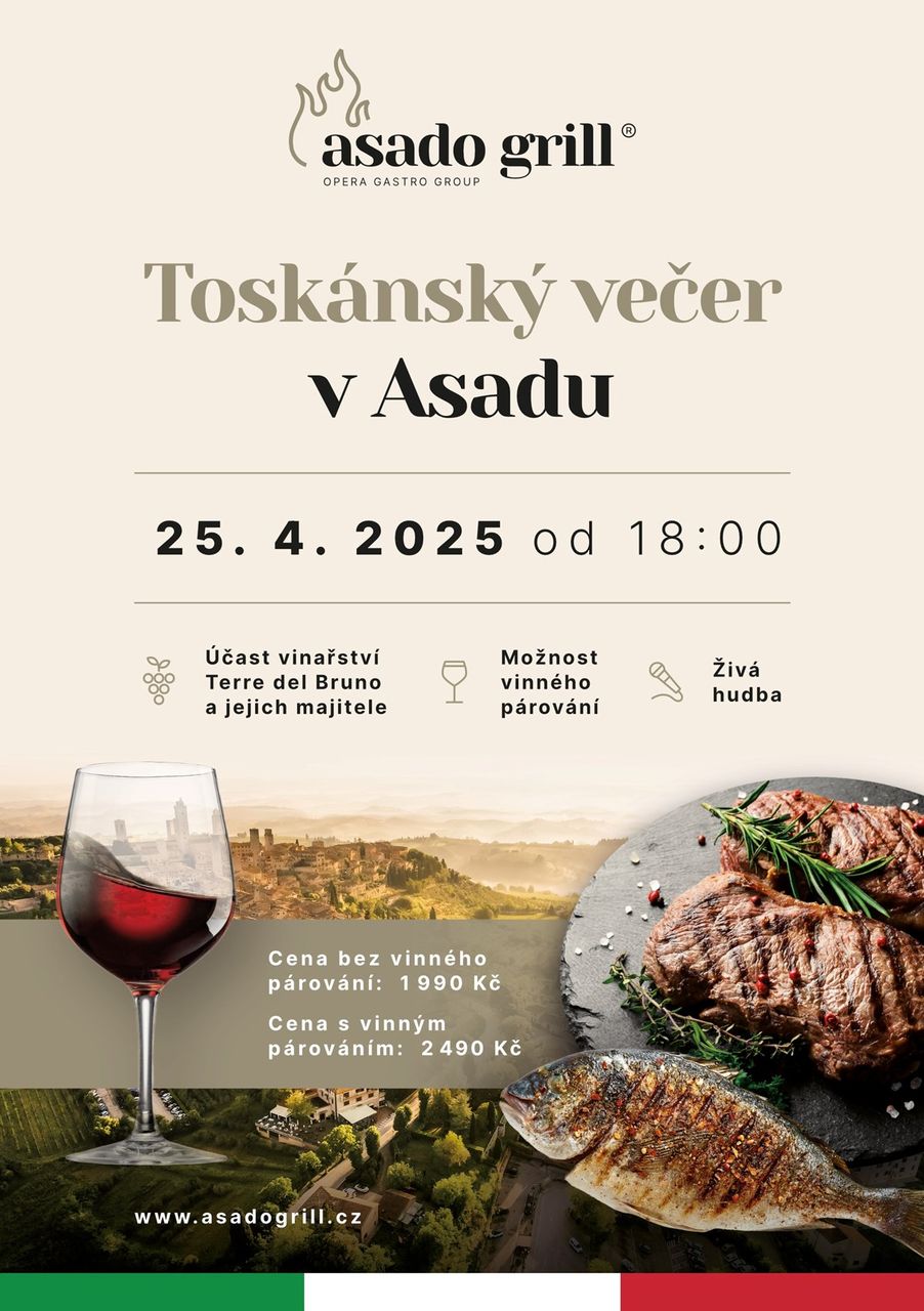Přijďte si užít jedinečný večer plný chutí a skvělého vína na jedinečnou degustaci do restaurace Asado Grill. Vinařství Terre del bruno se zrodilo z popela starobylé vesnice Pogni, která se nachází v srdci Chianti, nedaleko města Marcialla (mezi Firenze a Sienou). Dnes vedou podnik bratři Diddiové a jejich matka Lorella. Gianmarco Diddy vás osobně potěší svou návštěvou a prezentací svého skvělého portfolia.