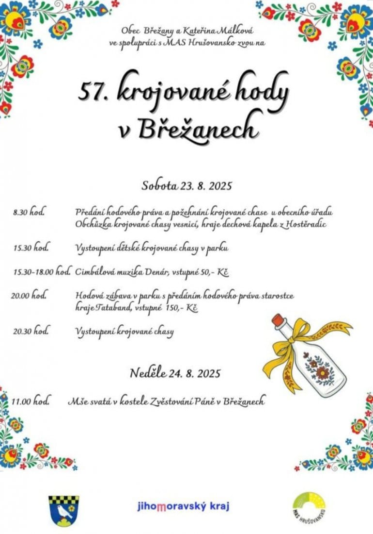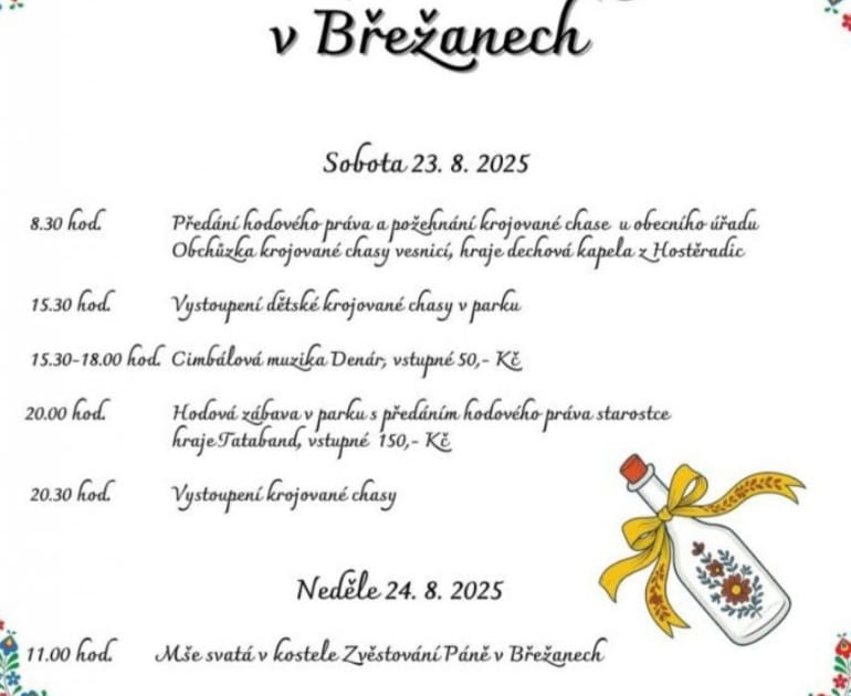 Tradiční krojované hody proběhnou předposlední srpnovou sobotu i v Břežanech u Znojma. V hlavní roli folklór a kroje, hudba a tanec, ale i víno a gastronomie. Tradiční předání práva a průvod chasy obcí zakončí večerní zábava se skupinou TATABAND a vystoupení krojované chasy. Víkendový program završí nedělní mše svatá v místním kostele.